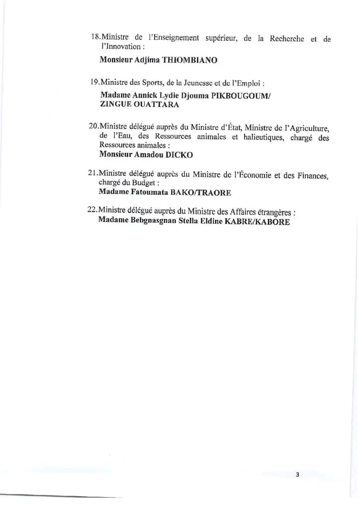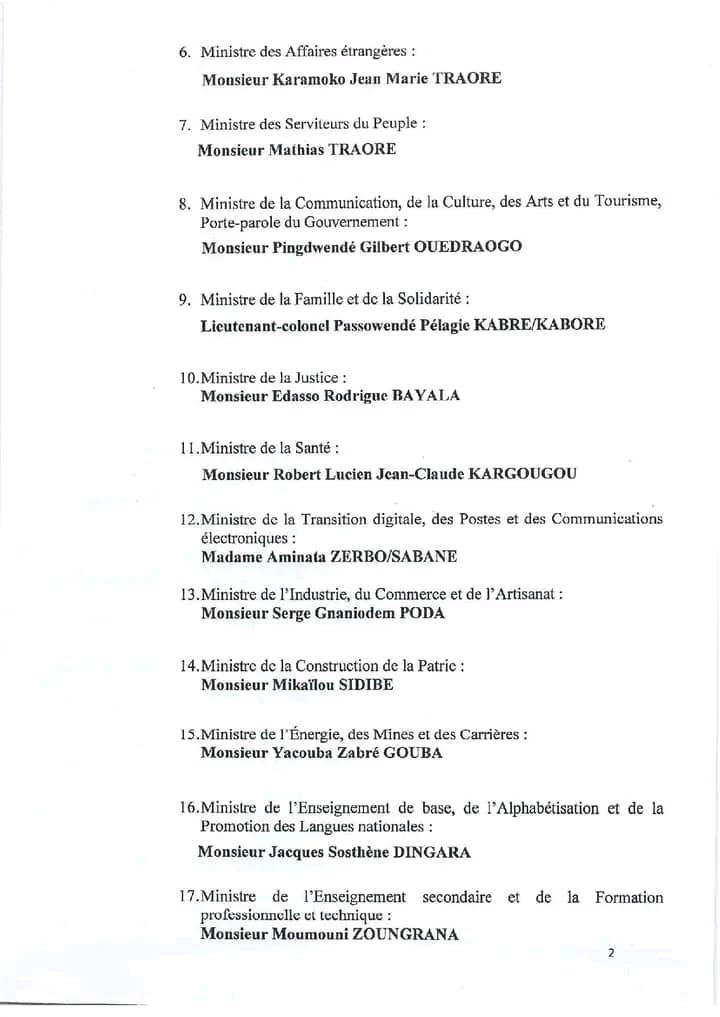 Ci-dessous, le nouveau gouvernement du Burkina Faso :