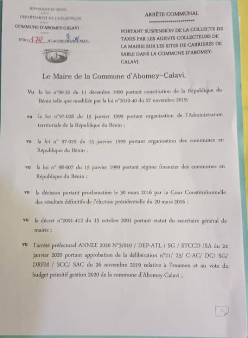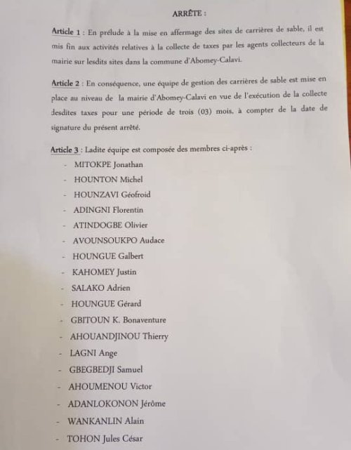 Par le biais d’un arrêté pris compte tenu de la mise en affermage des sites de carrières, le maire de la commune d’Abomey-Calavi, Angelo Ahouandjinou a mis un terme à la collecte des taxes sur les sites de carrières par ceux qui le faisaient auparavant. Par le même arrêté et en réponse à une nouvelle gestion, le maire vient d’autoriser une nouvelle équipe composée d’une vingtaine d’agents, autorisée pour désormais collecter les taxes au nom de la mairie.
