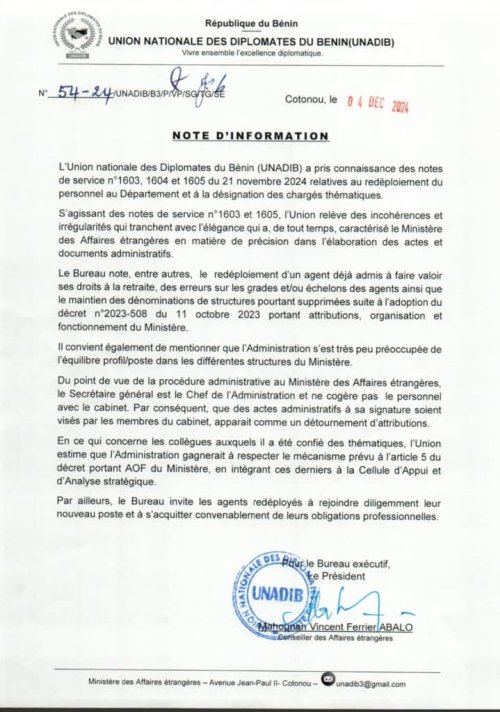 À travers une note d’information en date du 4 décembre 2024, l’Union Nationale des Diplomates du Bénin (Unadib), a exprimé ses griefs contre les notes de service n°1603, 1604 et 1605 du 21 novembre 2024, relatives au redéploiement du personnel au département et à la désignation des chargés thématiques. L’Union dénonce des irrégularités et incohérences qui tranchent avec l’élégance qui a, de tout temps, caractérisé le Ministère des affaires étrangères en matière de précision et d’élaboration des actes et documents administratifs.