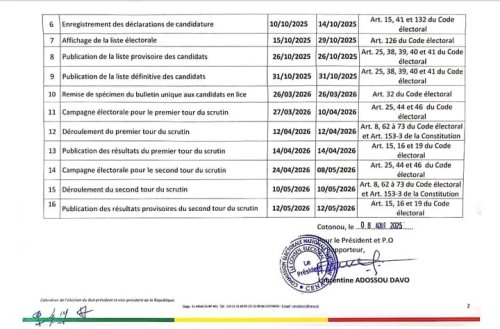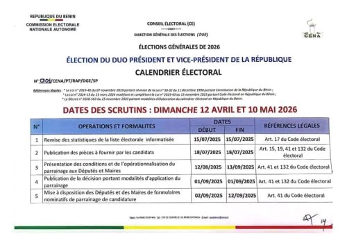 Conformément aux dispositions en vigueur, la Commission électorale nationale autonome (CENA) a dévoilé ce lundi 11 août 2025, le calendrier électoral, soit 90 jours avant la date du scrutin. Selon le document signé de son rapporteur, Laurentine Adossou Davo, la mise à disposition des députés et des maires de formulaires nominatifs de parrainage de candidature démarre le 2 septembre 2025 et s’achève le 12 septembre. Ci-dessous les autres détails importants.