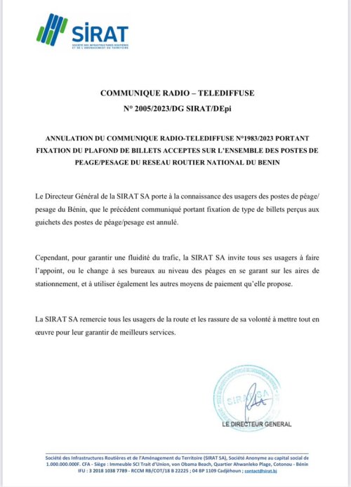 A la faveur d’un communiqué radio, le Directeur général de la SIRAT SA, a rapporté son communiqué précédent, fixant le type de billets de banque à présenter aux postes de péages/pesages.